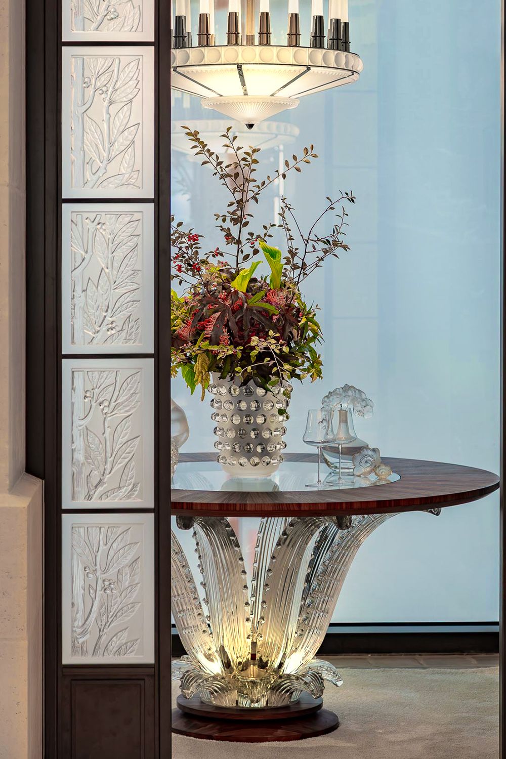 Luminous arches adorned with the Laurel motif evoke victory and eternity, while the floral dahlia flooring pays tribute to nature, René Lalique’s eternal muse.