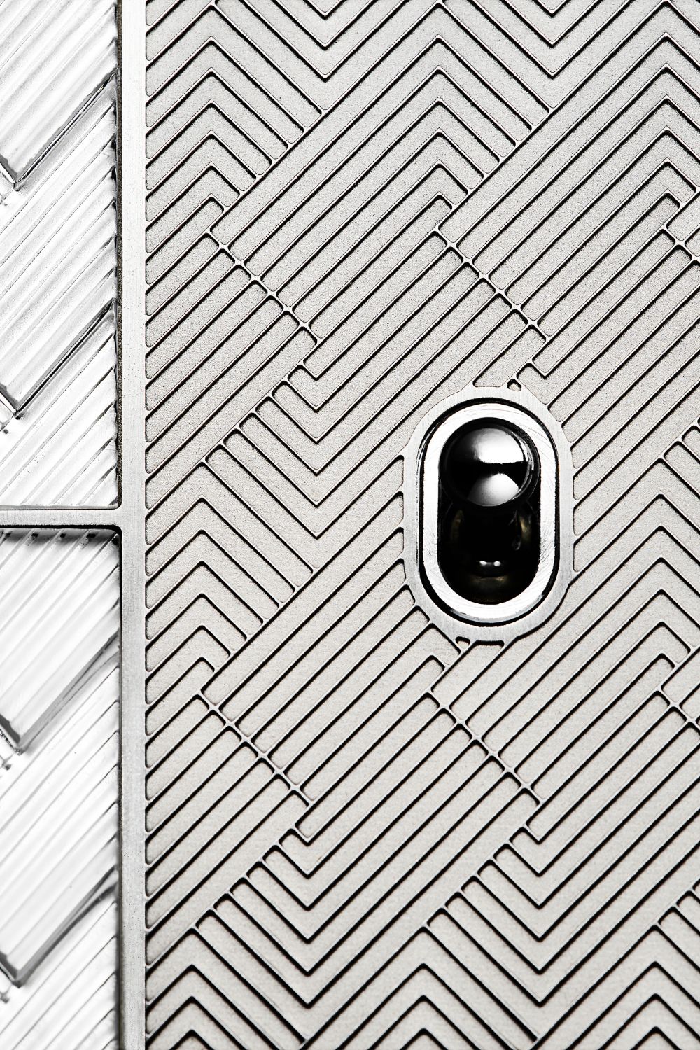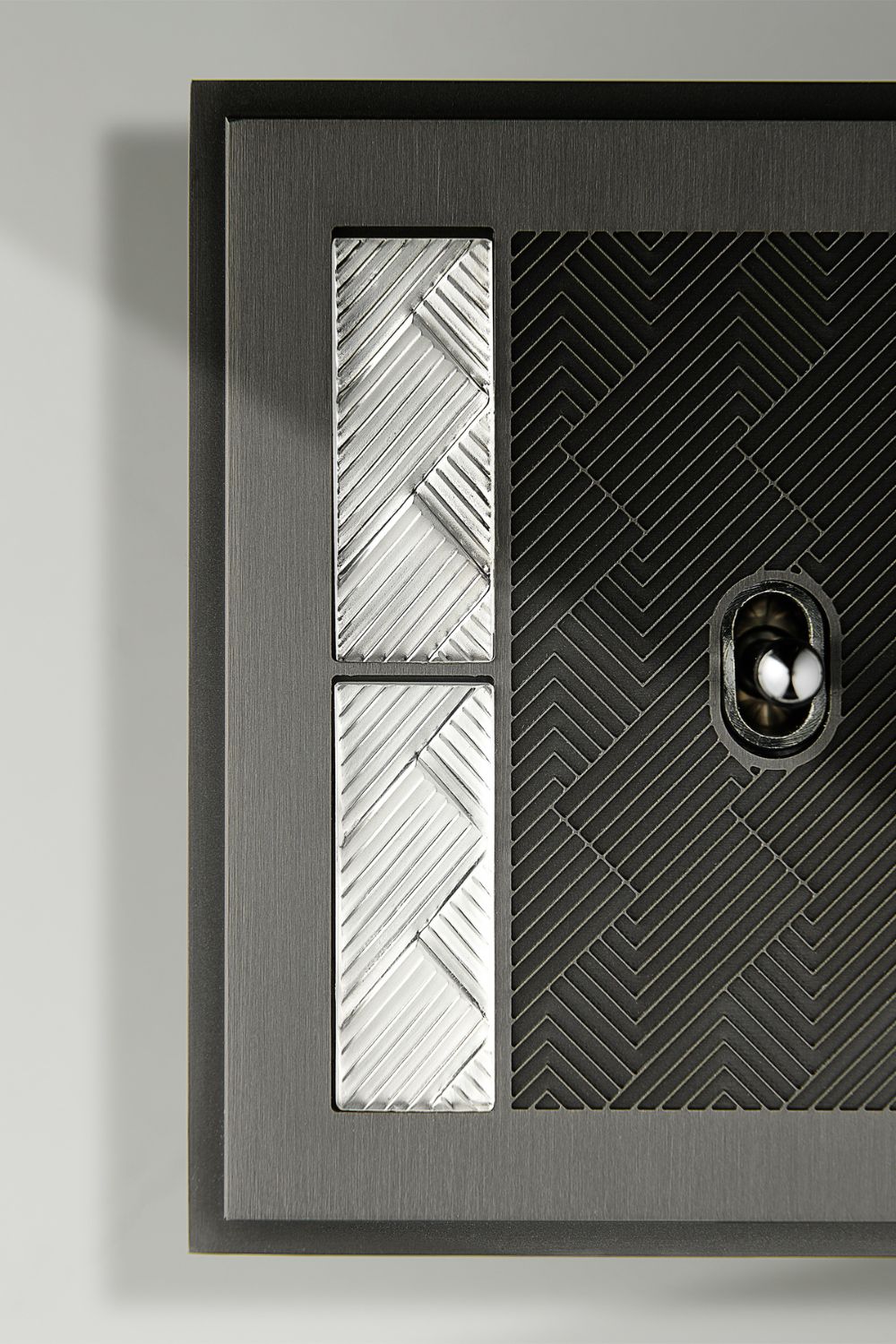 The know-how of two iconic names comes together in an elegant synthesis of materials: delicate panes of Lalique crystal slot perfectly into brass plates manufactured by Meljac, which magnify the shimmering crystal reflections.