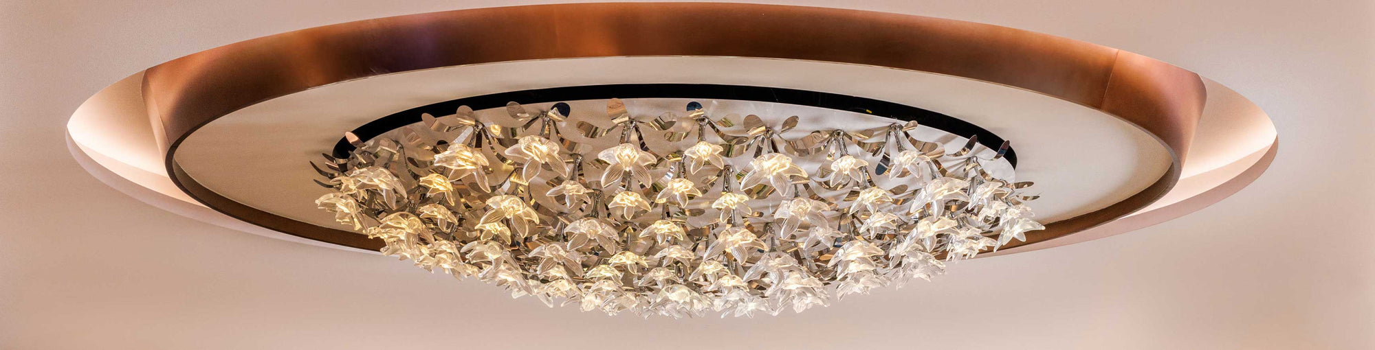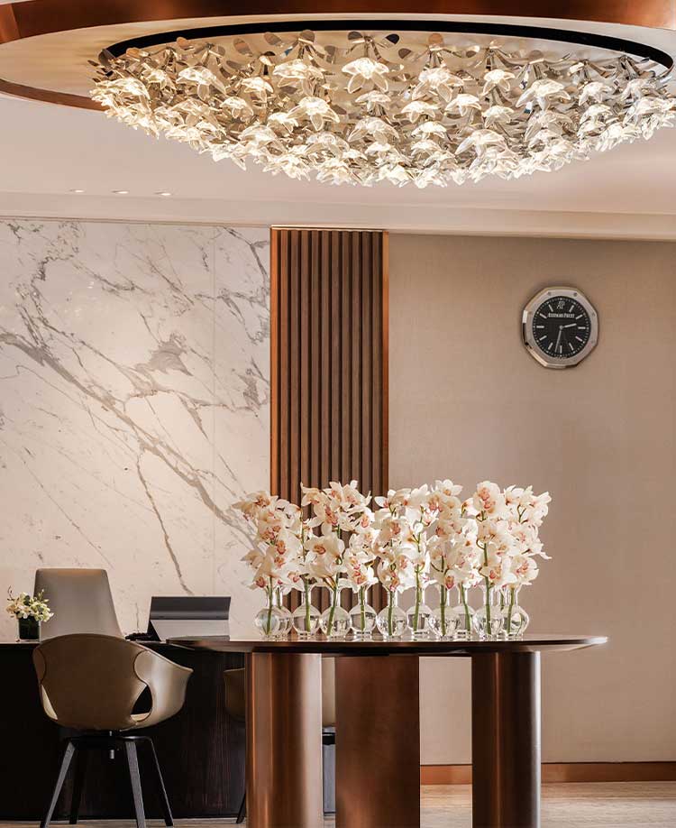 The Lalique light dome, which adorns the lobby of the Private Room, which offers Singapore Airlines (SIA) Suites and First Class customers a private and sophisticated space to rest and relax, comprises more than 107 crystal flowers inspired by Aquatic Ginger, one of the 10 native flowers in SIA’s batik motif. They are designed by Marc Larminaux, Lalique’s Artistic and Creative Director, working closely with Adeline Lunati, Head of the Lalique Interior Design Studio. Created to appear as if it is ‘a crystal bouquet floating in the sky’ the complex suspended installation is set against a dense foliage of polished metal leaves to further enhance the brightness of the flowers. Each light embedded into the satin polished crystal flower diffuses and evolves in terms of intensity and colour according to the time of day.