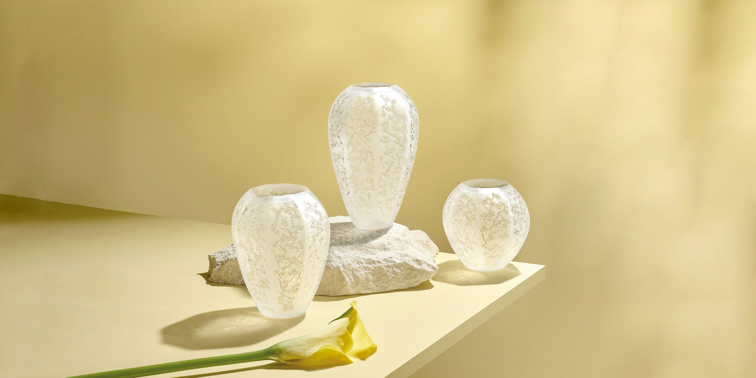 Lalique saisit le pouvoir décoratif et symbolique de la pivoine, du muguet, de l’orchidée ou des cerisiers en fleurs.