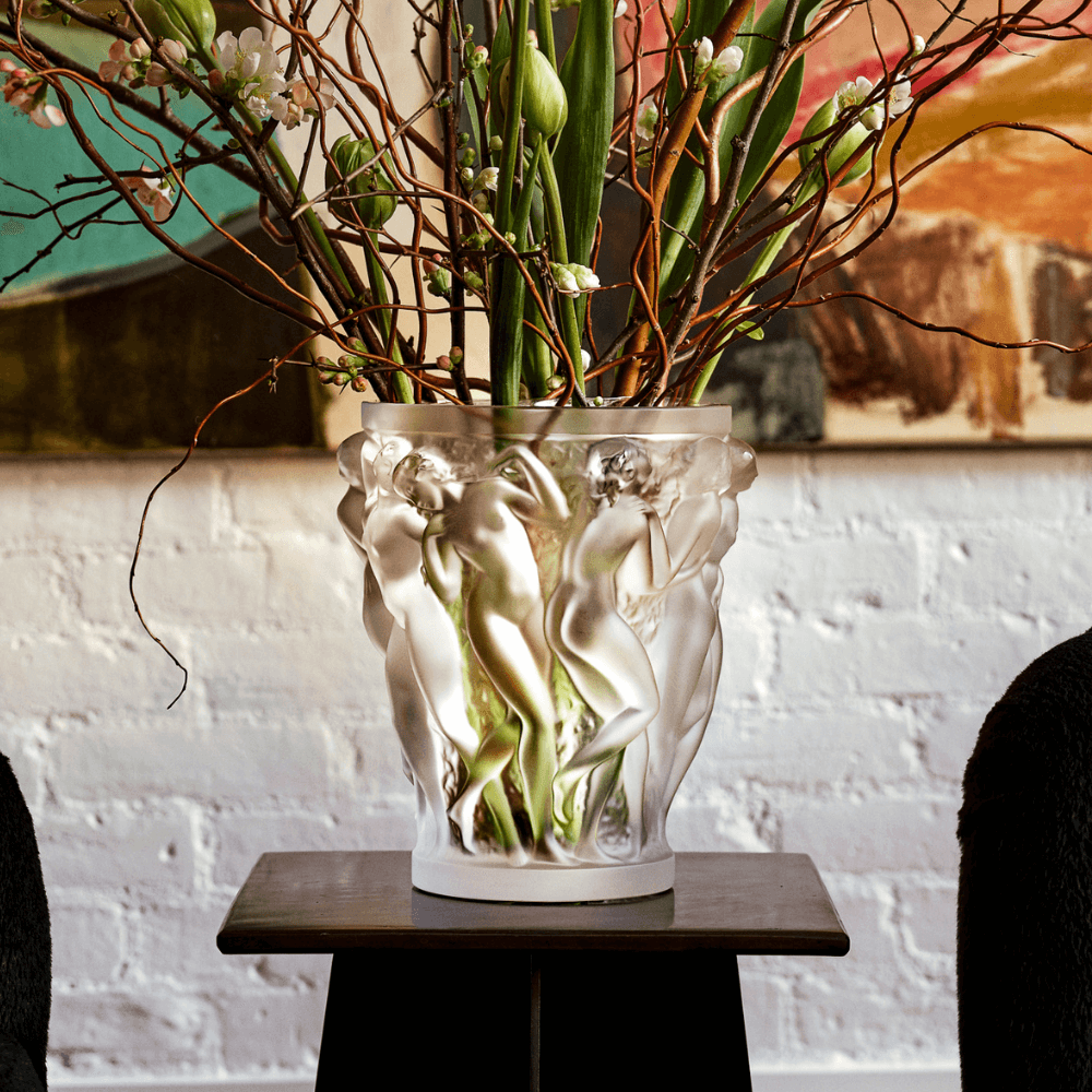 En 1927, l’imagination et le génie créatif de René Lalique donnent naissance au vase Bacchantes. Majestueuse ode à la féminité, la ronde de nus sculpturaux des pièces Bacchantes est emblématique du style Lalique.