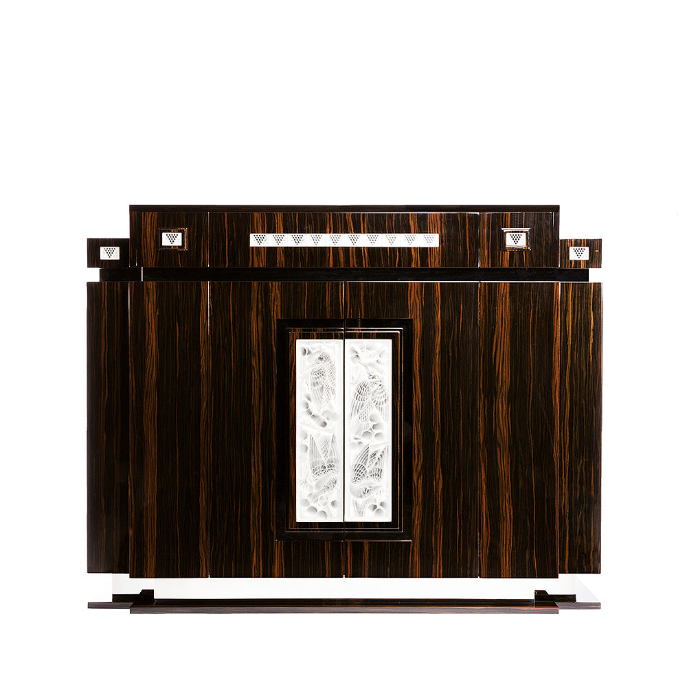 En 1928, René Lalique conçoit les panneaux décoratifs Merles & Raisins en verre blanc moulé pressé sur fond argenté pour orner les marqueteries en acajou de Cuba du Wagon Présidentiel de l’Orient Express. Le motif Merles et Raisins, motif synonyme d’élégance et «d’Art de vivre», représente des merles picorant une petite grappe de raisins.
