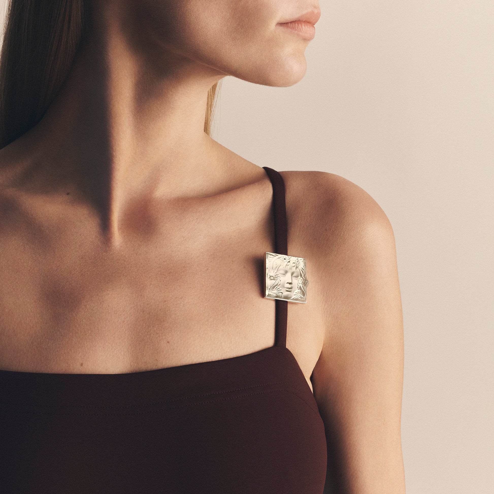 Le célèbre motif « Masque de Femme » révèle le visage d'une femme mystérieuse aux traits délicats coiffée d'une faune aquatique qui symbolise la nymphe Aréthuse.