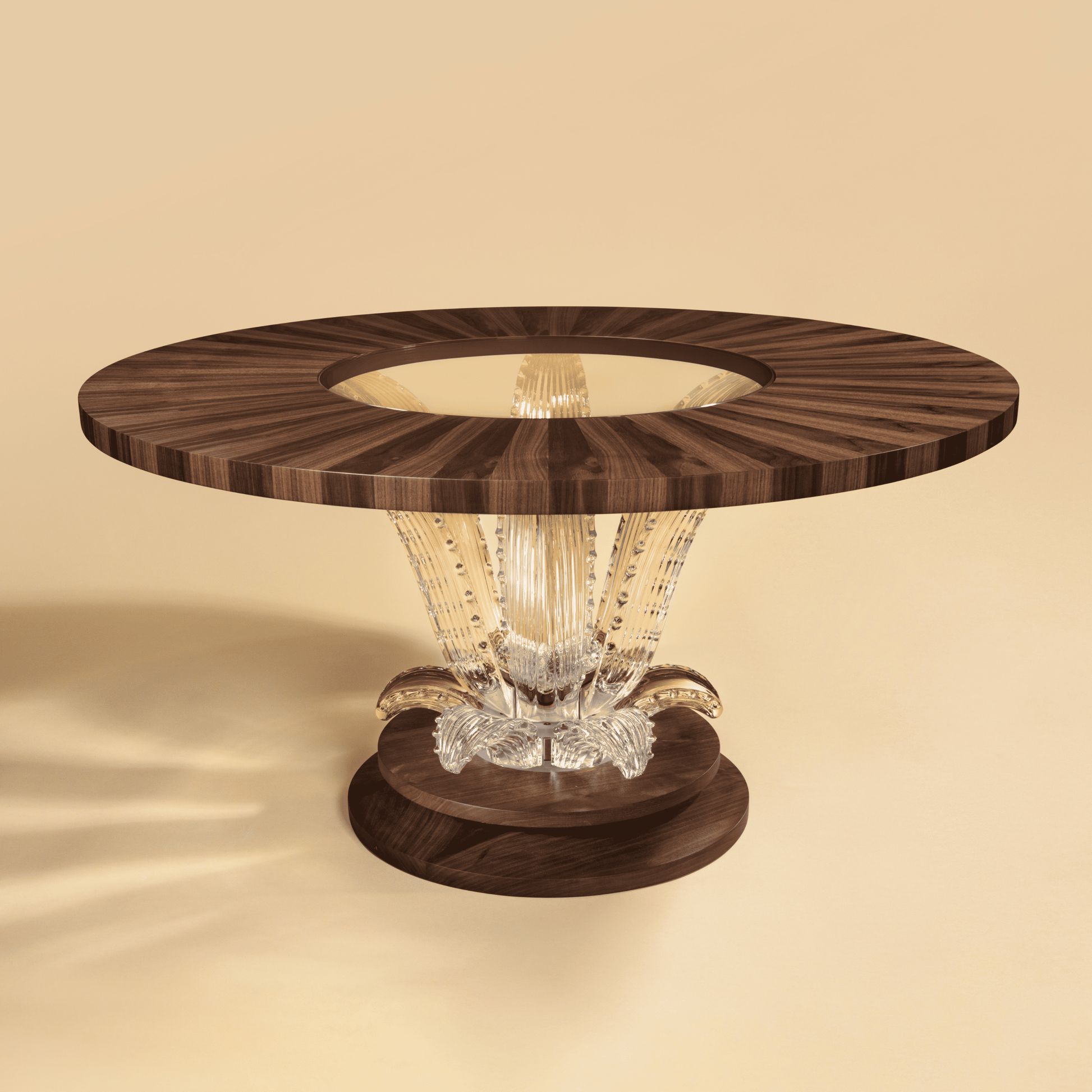 Son plateau rond en marqueterie de noyer américain, encadrant une dalle de verre, dévoile par transparence les détails du cristal.