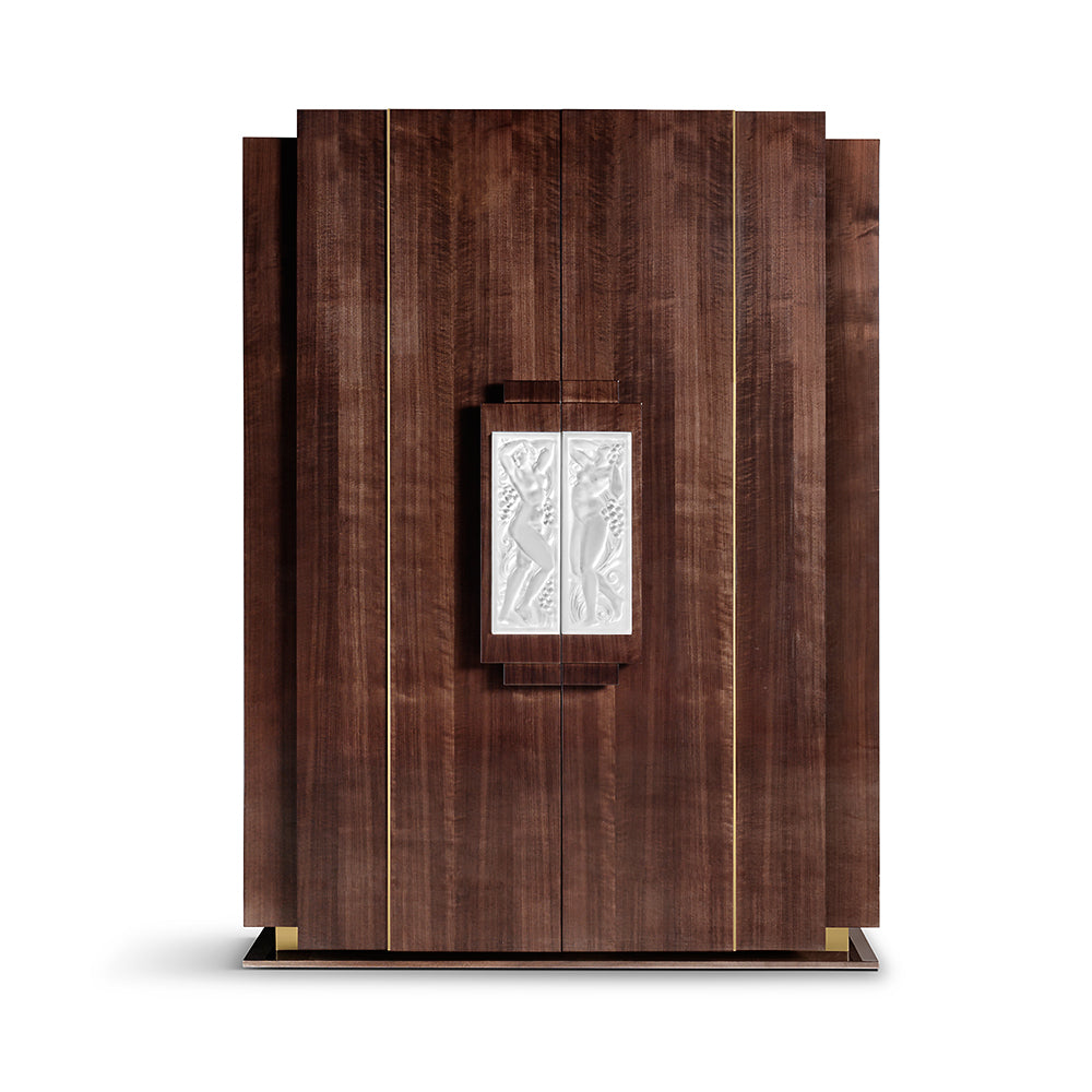 Part of the Lalique Maison collection, the Femme Bras Leves Bar features decorative panels created by René Lalique in 1928 to adorn the cars of the famous Orient Express train, which led travelers from the banks of the Seine to the shores of the Bosphorus. René Lalique stands alongside René Prou as one of the most admired artists who have contributed to the decoration of this train.