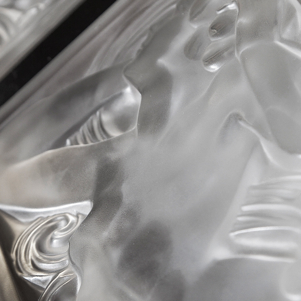 We can witness a sensual and elegant dance. The women moves gracefully surrounded by volutes and grapes. This crystal panel captures light and plunges the viewer into a poetic world.