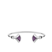 A duo of crystals subtly sculpted radiate on this Larcade flexible bracelet. The geometric silhouette of the openwork frame is inspired by the decorative structures of the period, with arches combining metal and glass. Timeless clear crystal set in luminous gold, or silver with dusk purple crystal, are adorned with a thin black lacquer inspired by Art Deco.