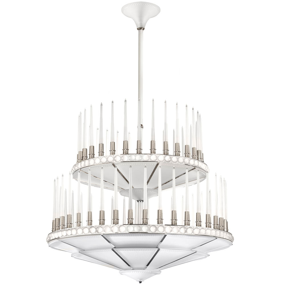 Carved with stripes and cabochons with the satin finish emblematic of Lalique, the crowns of light are adorned with slender crystal candles, arranged in a rhythmic rigor. Metal sublimates the purity and brilliance of crystal.